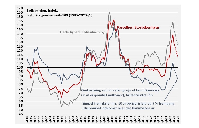 Uden prisfald ville boligbyrden for ejerlejligheder i København være hele 66 % over det historiske gennemsnit for de seneste små 40 år – og lige en spids over niveauet tilbage fra sommeren 2006. Nu ligger den ”kun” 45 % over det historiske gennemsnit. Trods betydelige prisfald er det altså stadig særdeles dyrt. Det skyldes en årrække med kraftige prisstigninger og et markant højere renteniveau end tidligere.